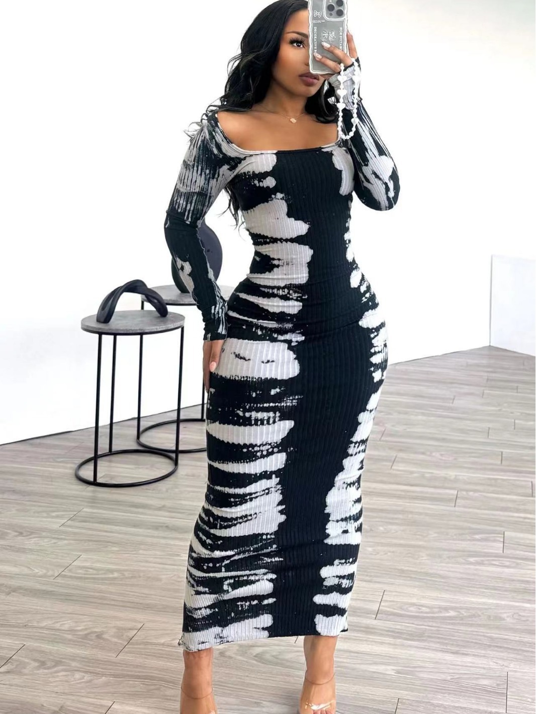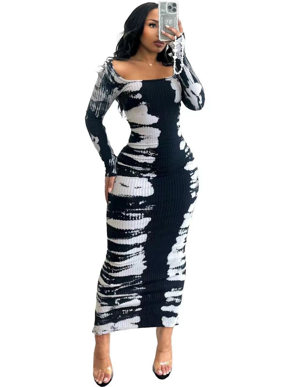 Color Contrast Long Sleeve Square-neck Sheath Dress