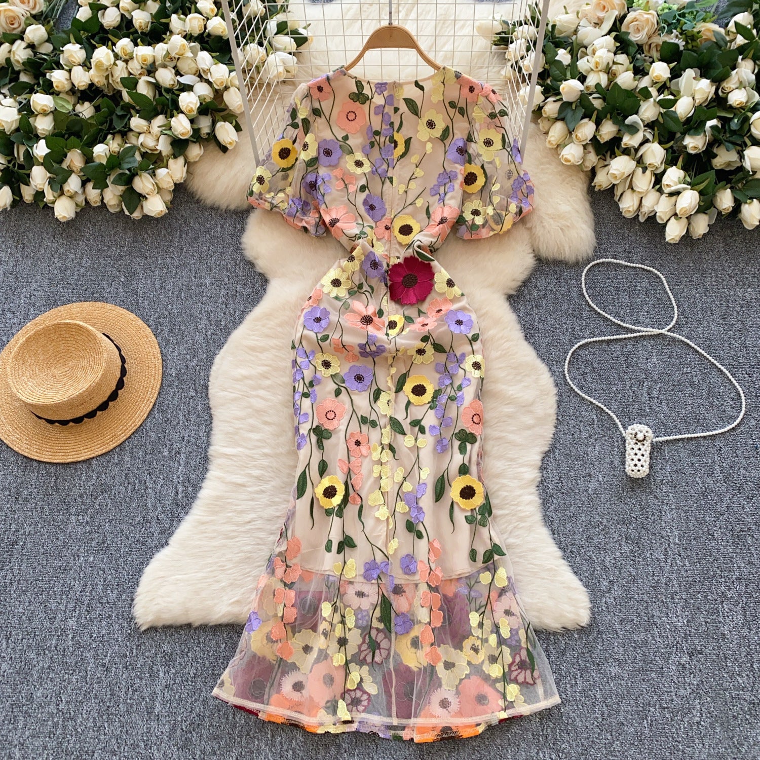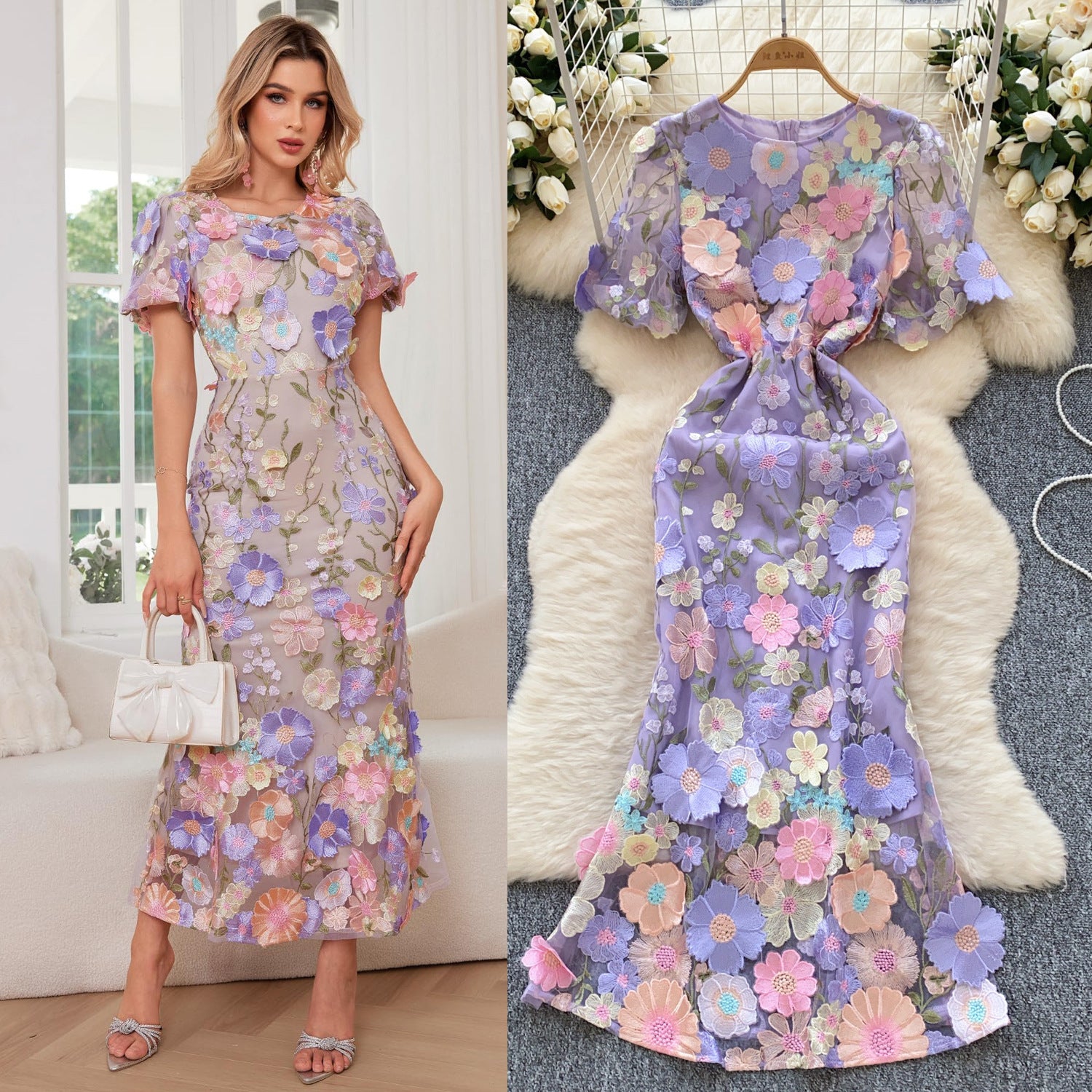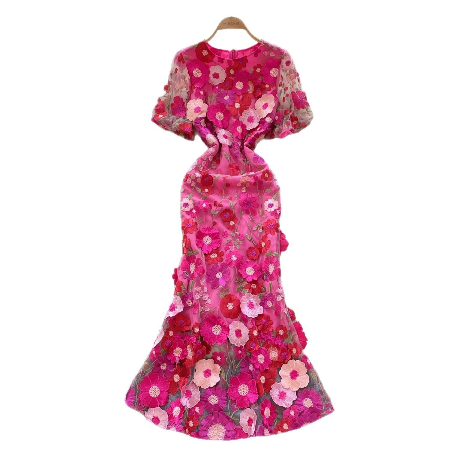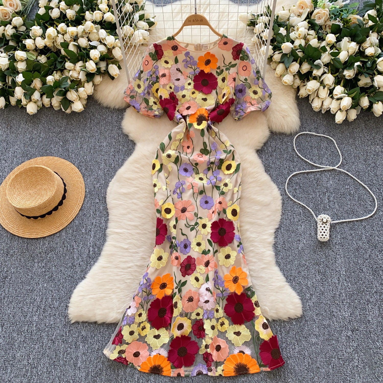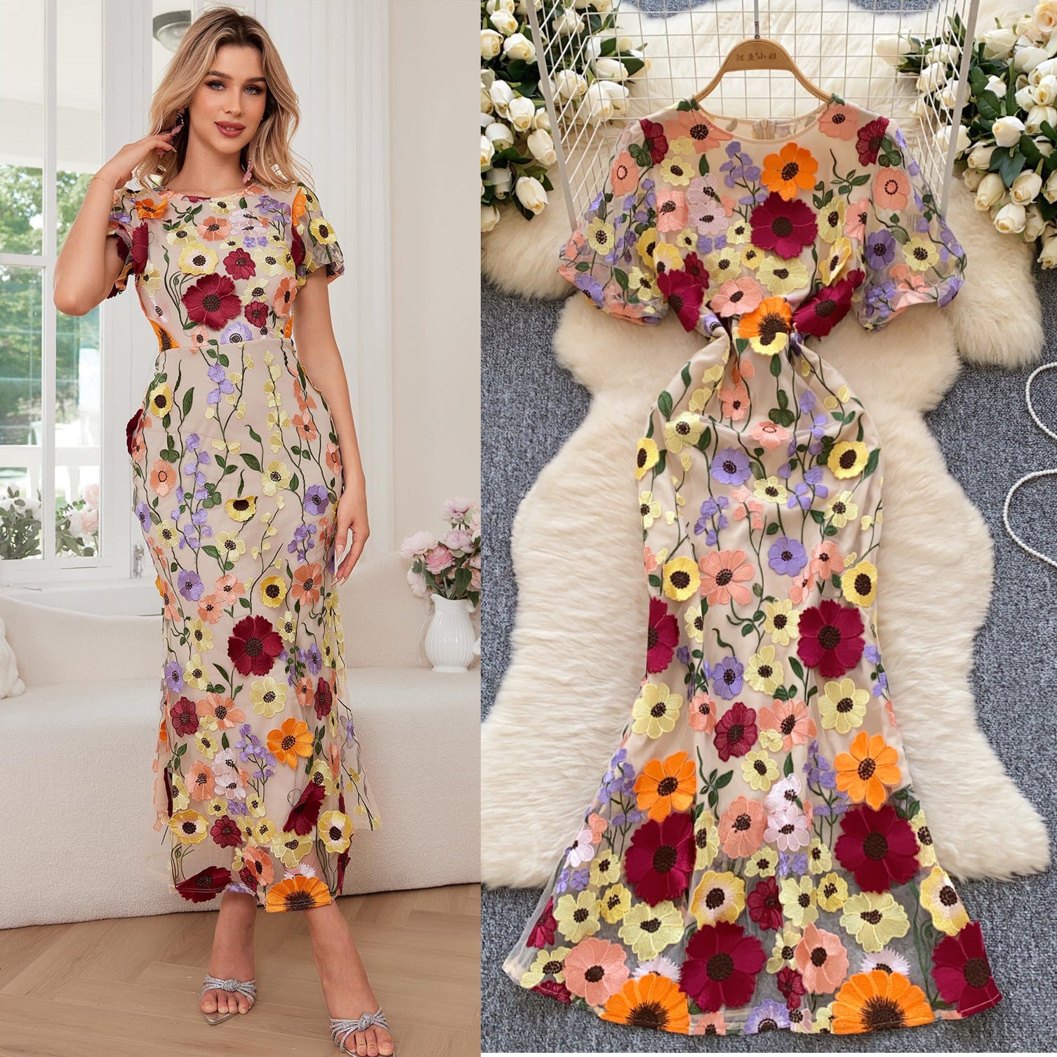 Elegant Flower Embroidery Round Neck Slim Waist Fishtail Dress