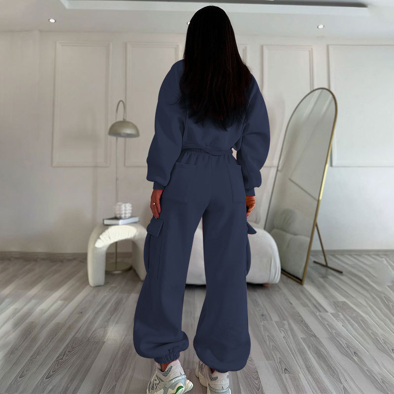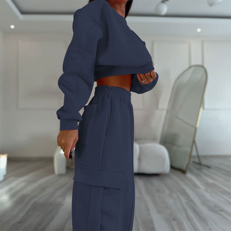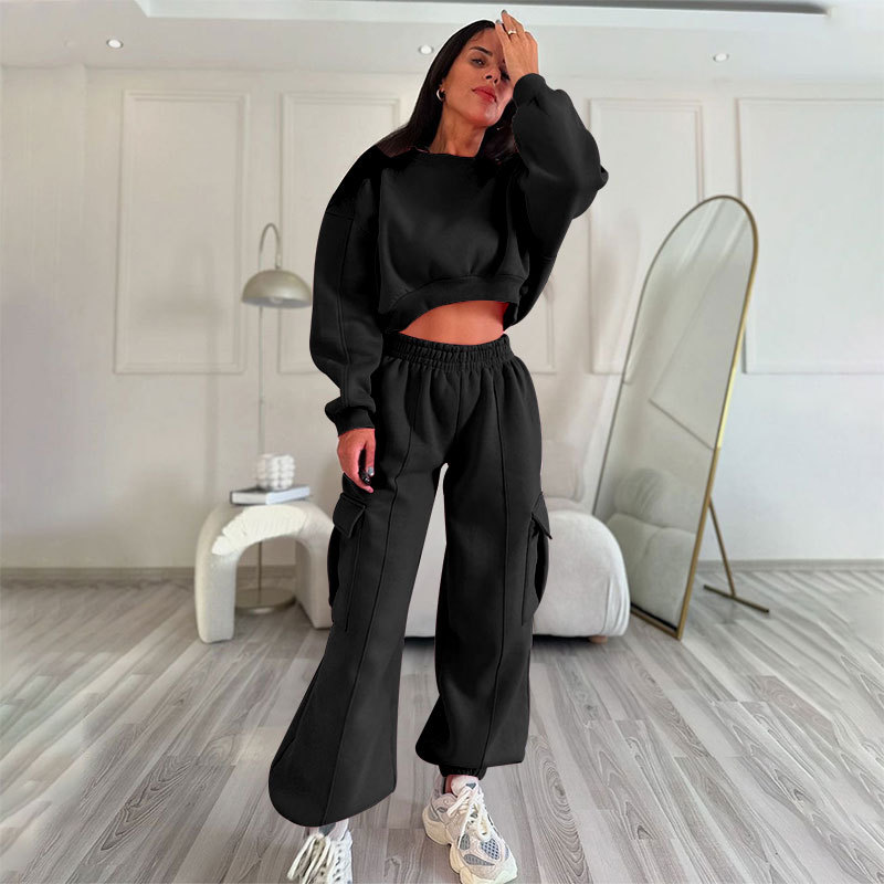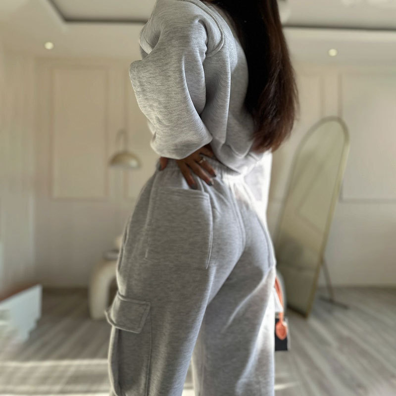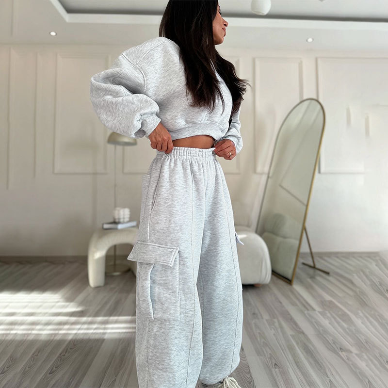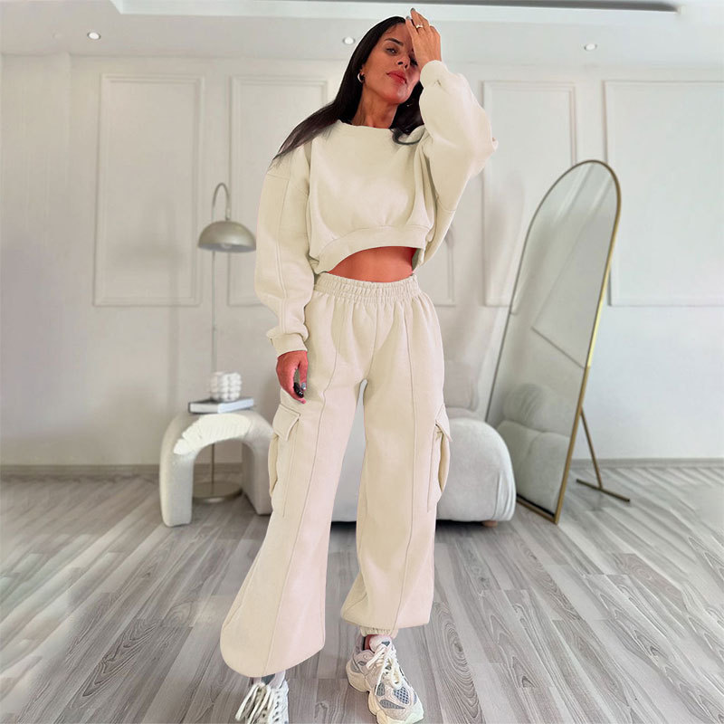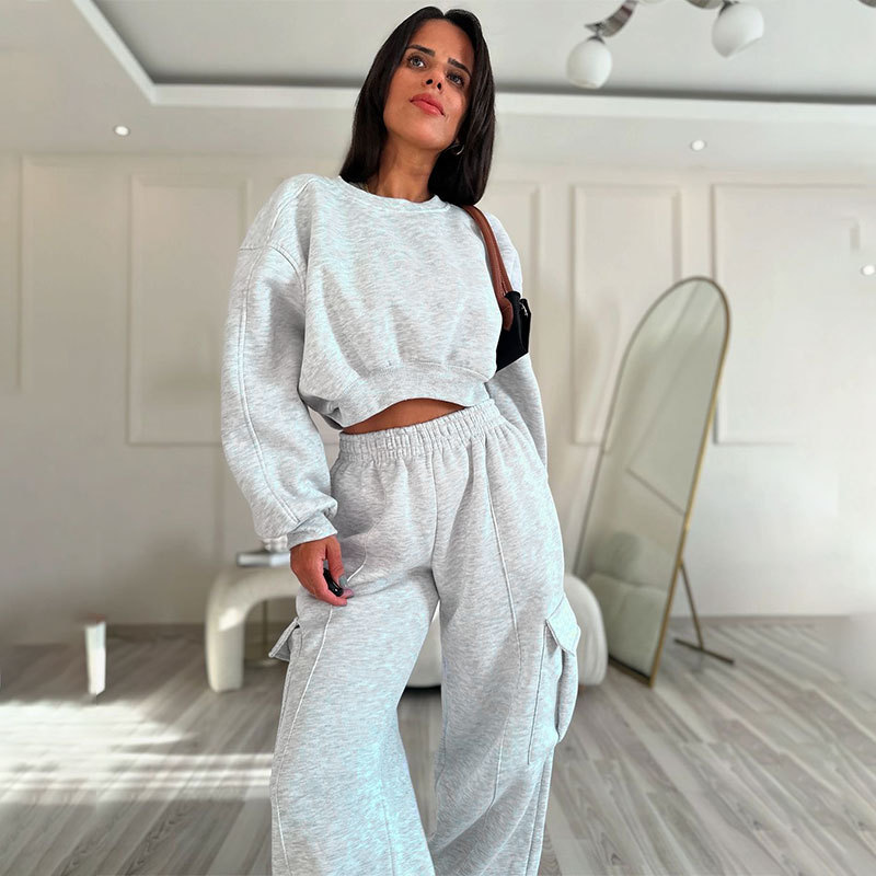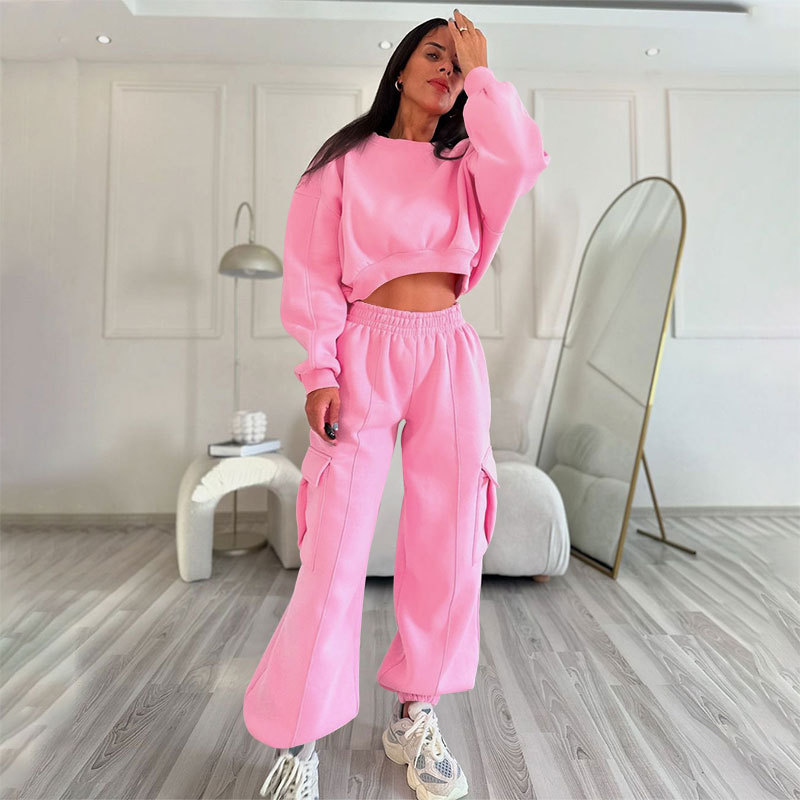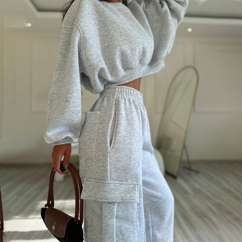 European And American Autumn New Round Neck High Waist Sweater Pocket Loose Sweatpants Suit
