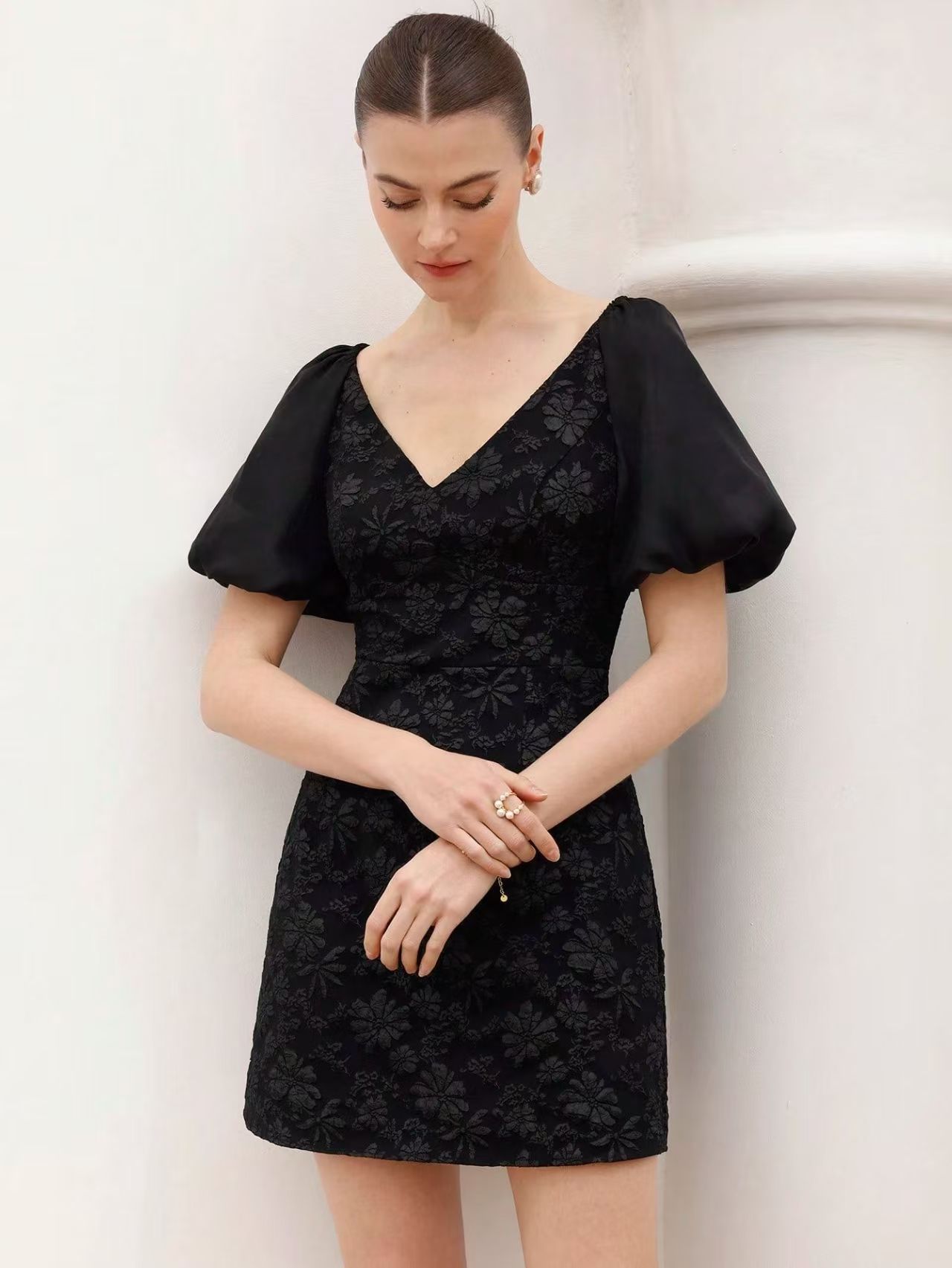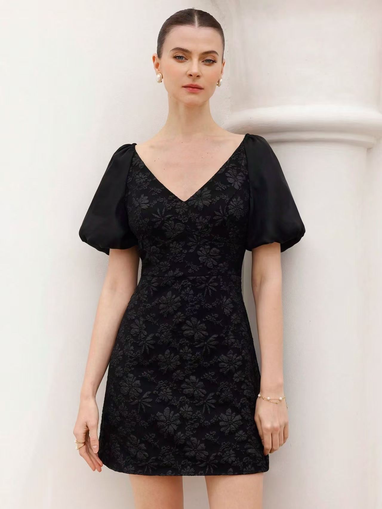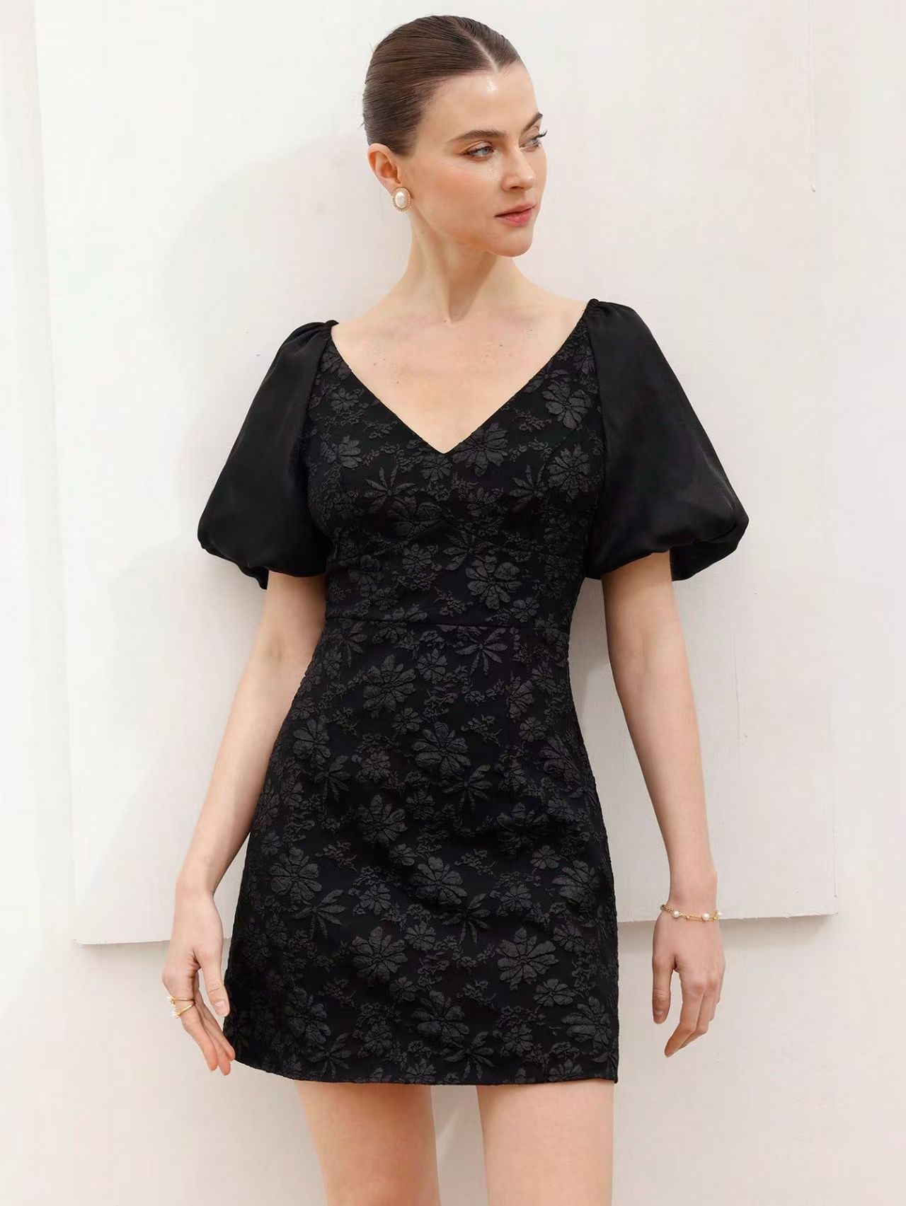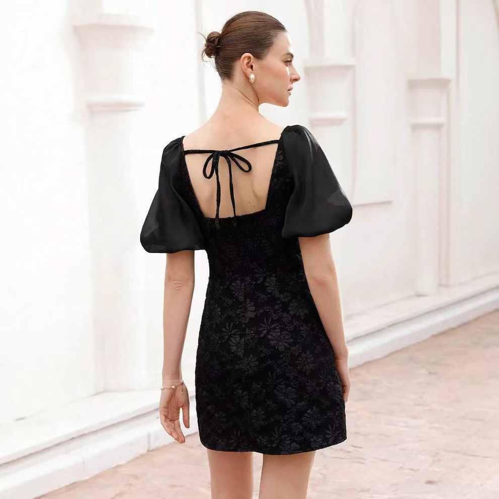 Retro Waist-Cinching Lace-Up Patchwork Pleated-Sleeve Dress