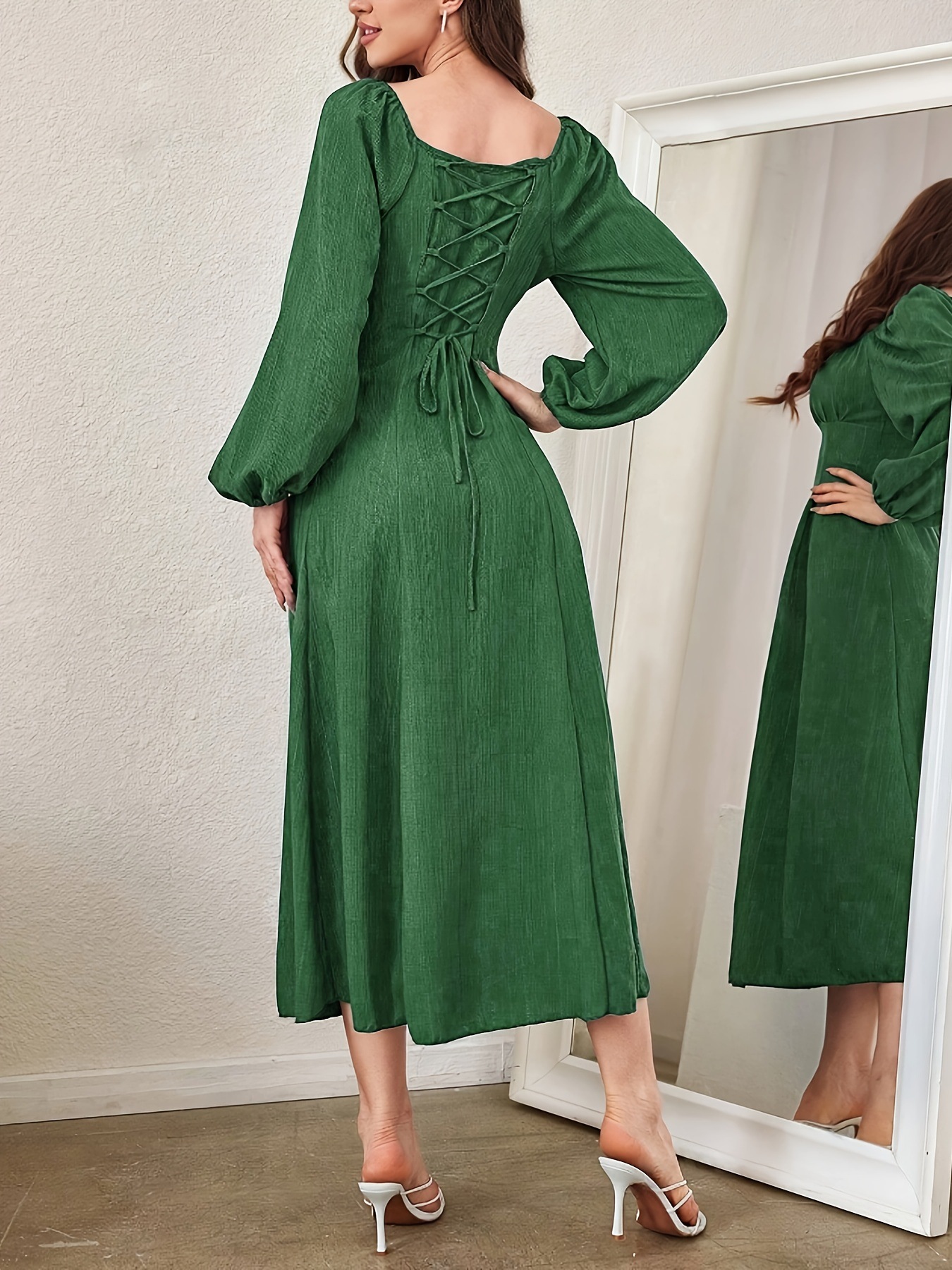 Stunning Textured Cross Tie Lantern Sleeve Midi Dress