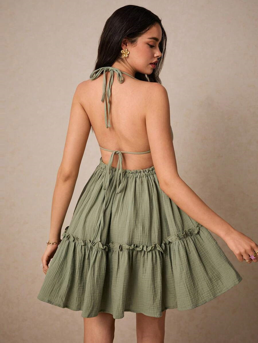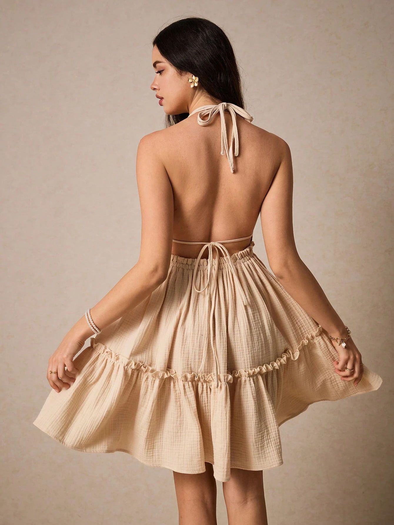 Women's Deep V-neck Drawstring Lace-trimmed Parallel Pleated Backless High-end Dress