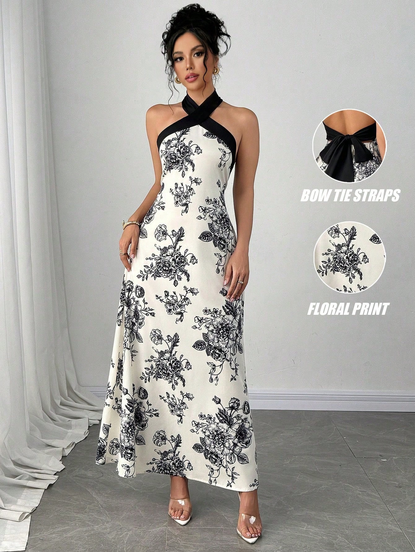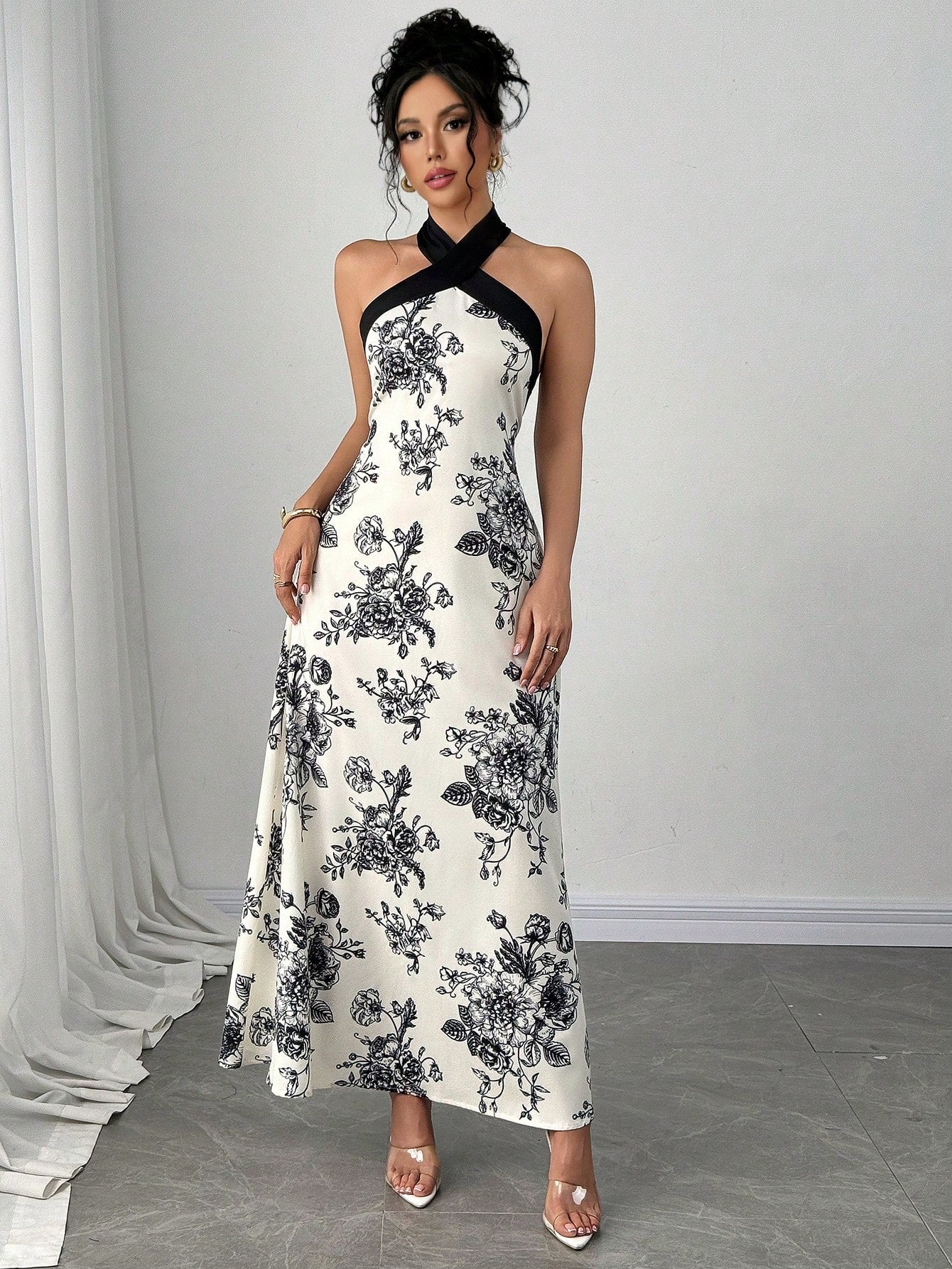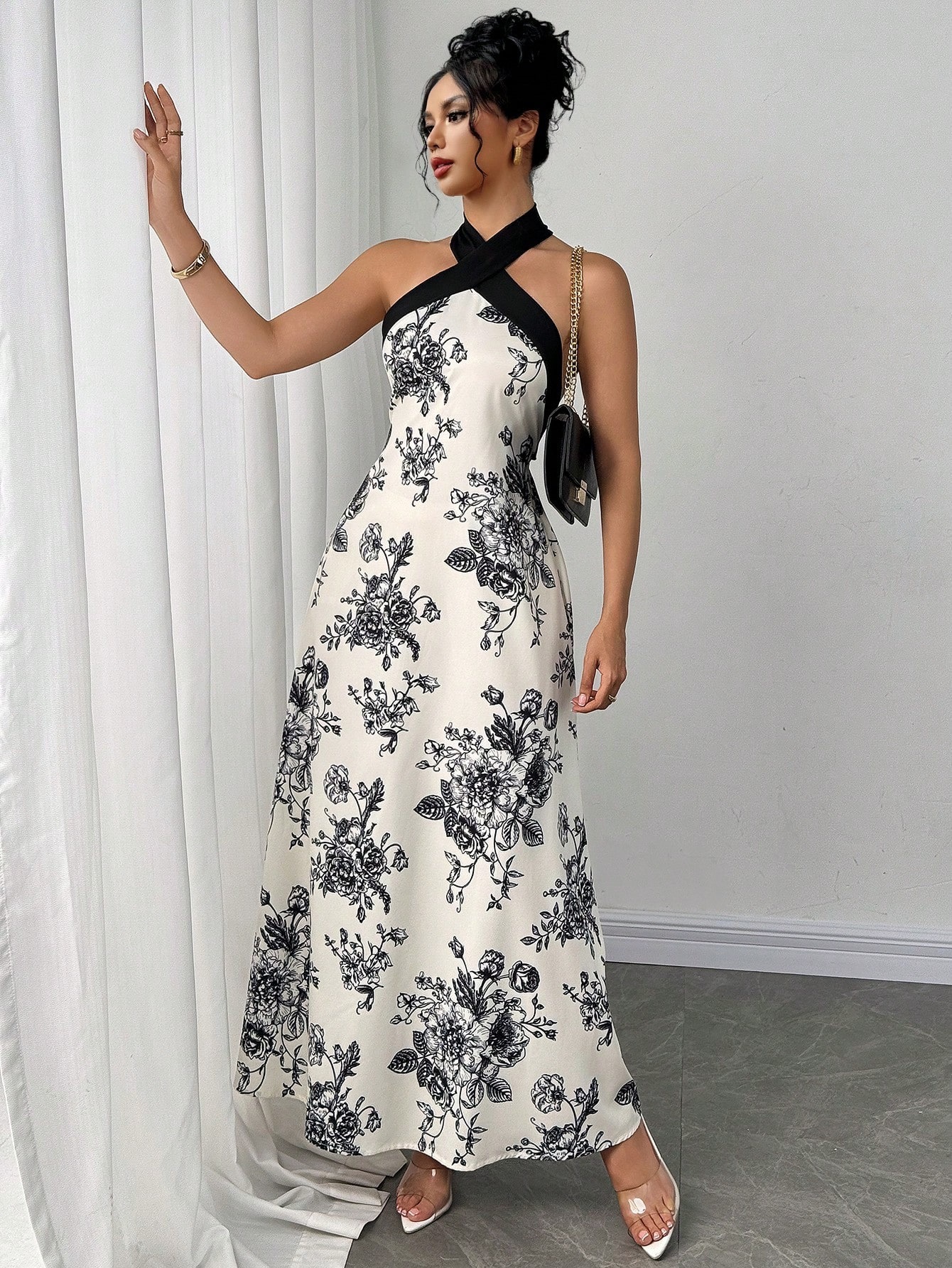 Women's Elegant Apricot Floral Cross-Neck Off-Shoulder Fashion Dress