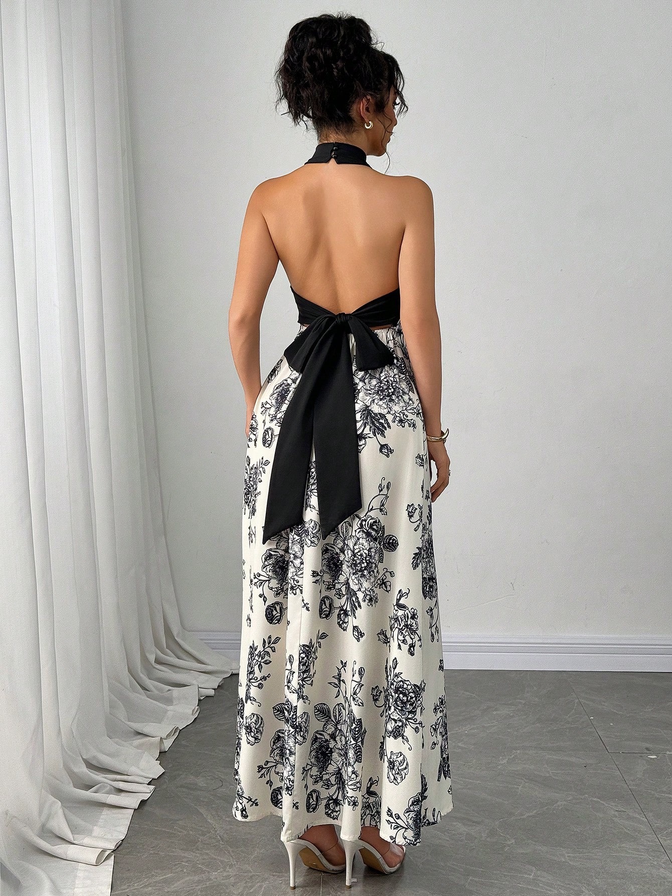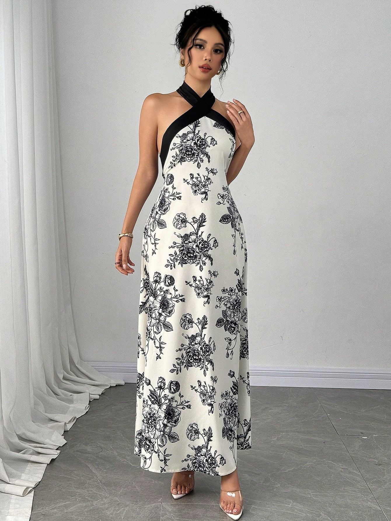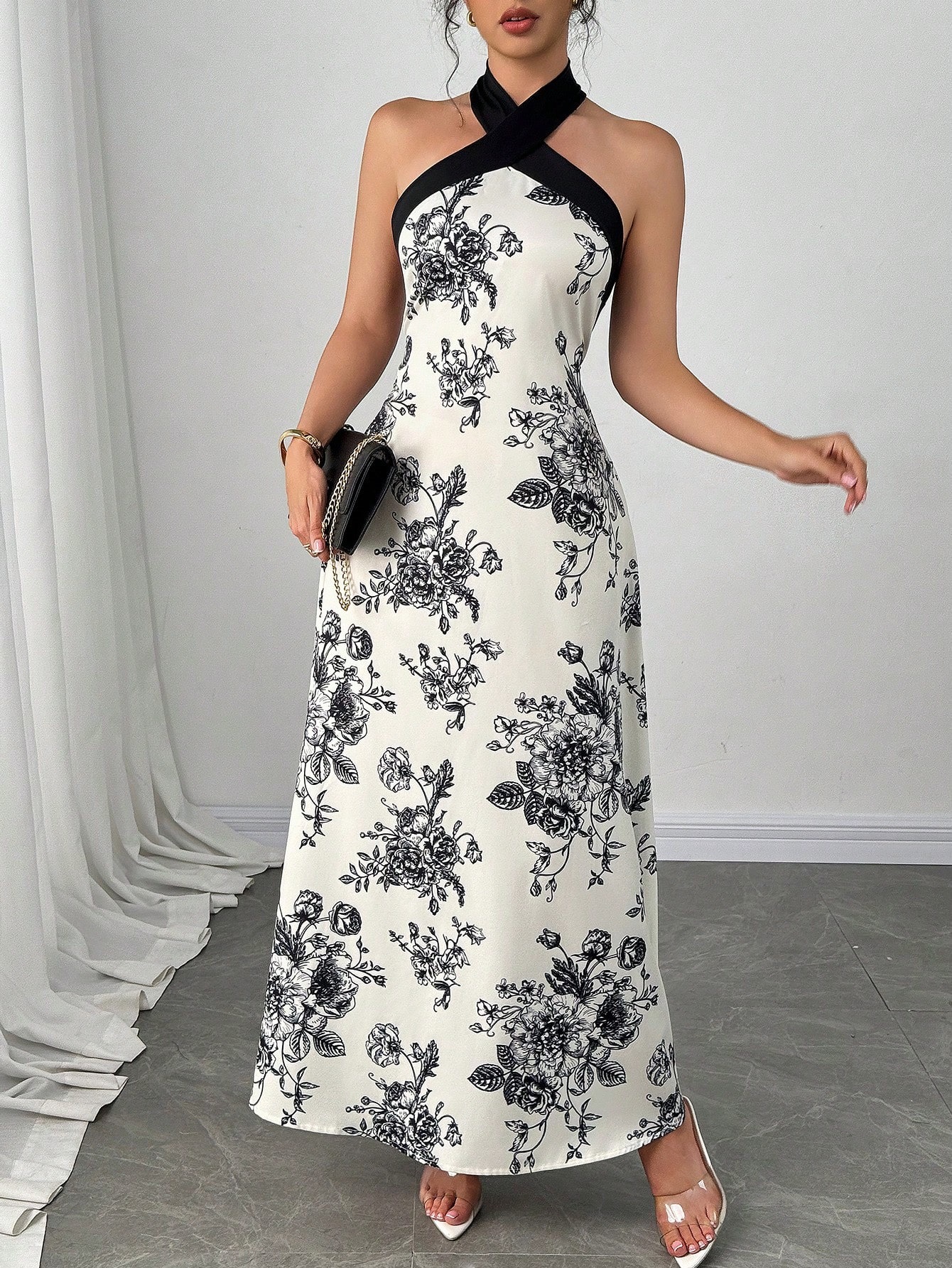 Women's Elegant Apricot Floral Cross-Neck Off-Shoulder Fashion Dress