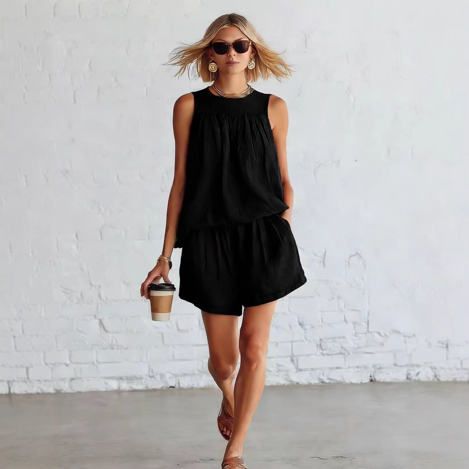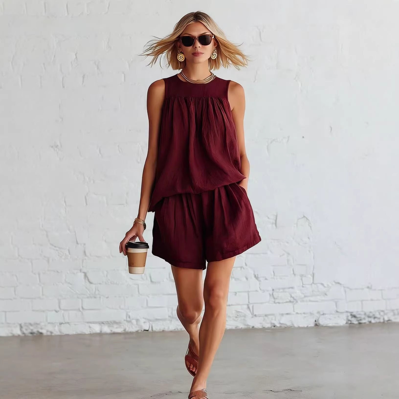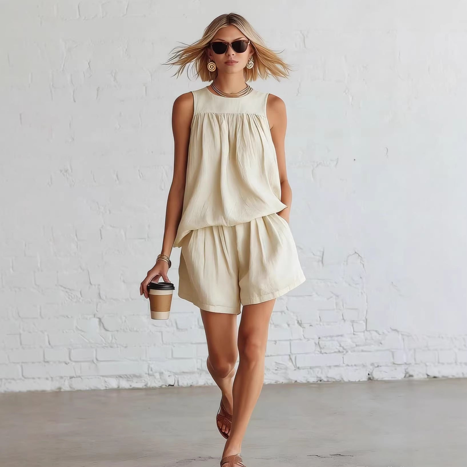 Womens Fashionable Retro Cotton-Linen Sleeveless Top And Wide-Leg Shorts Set