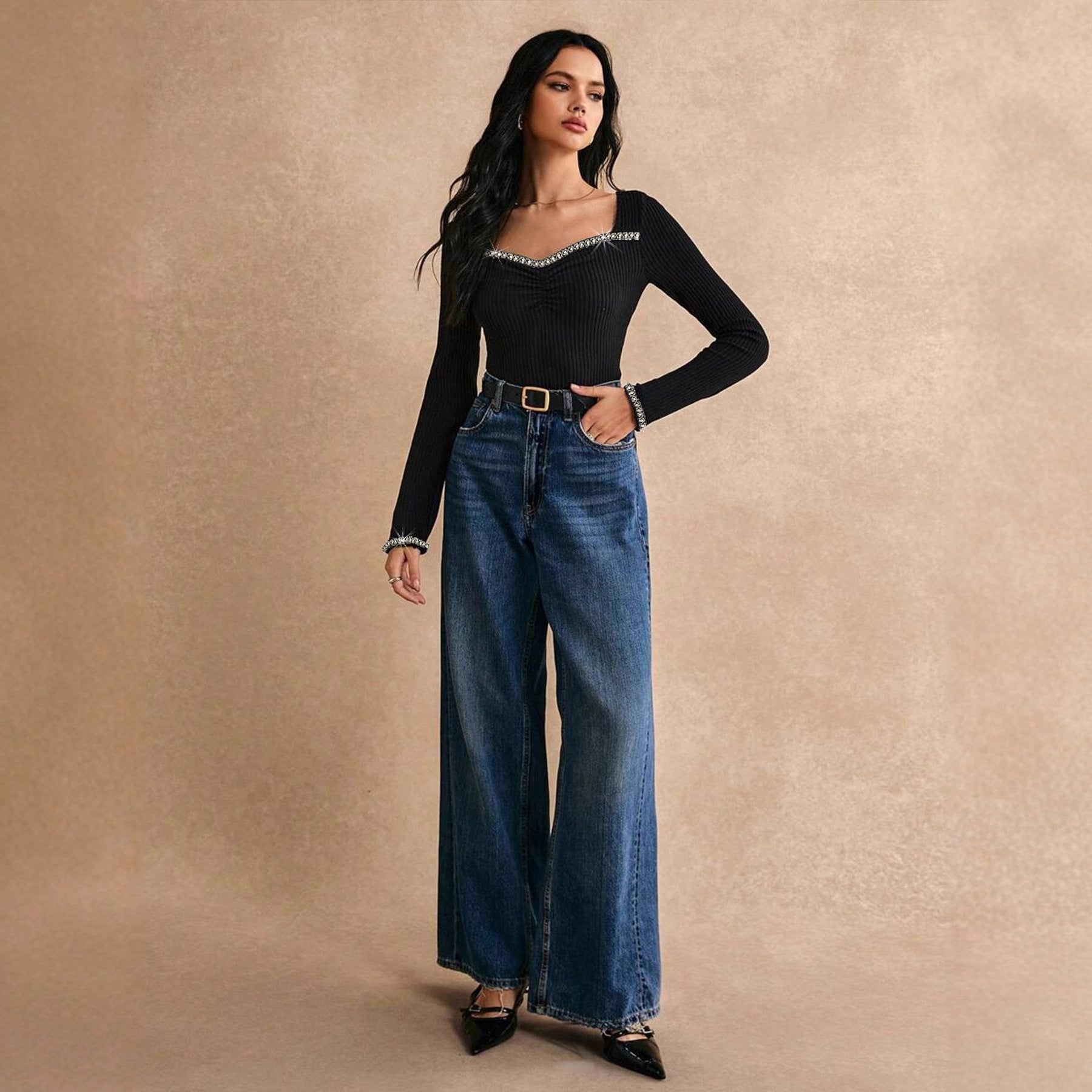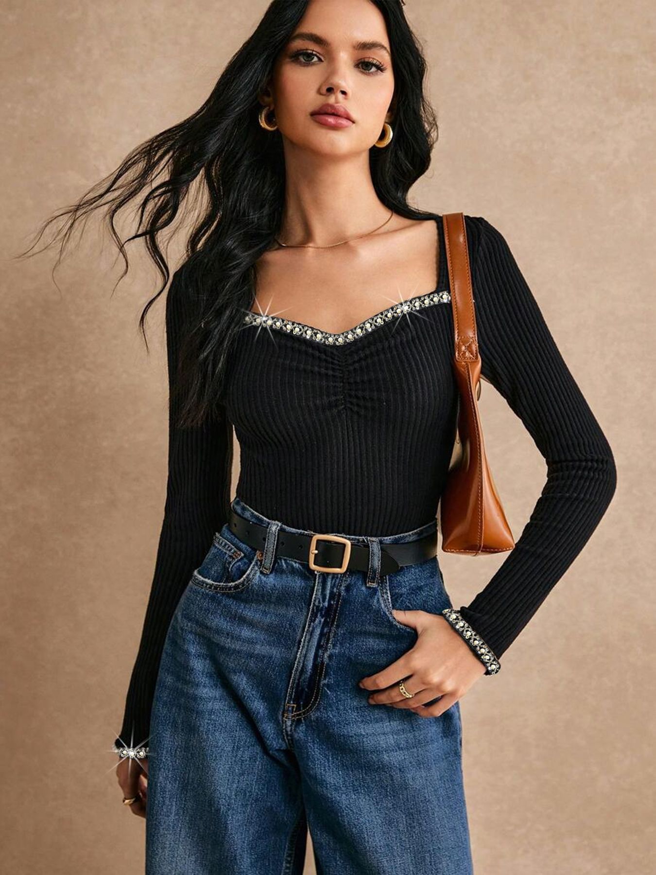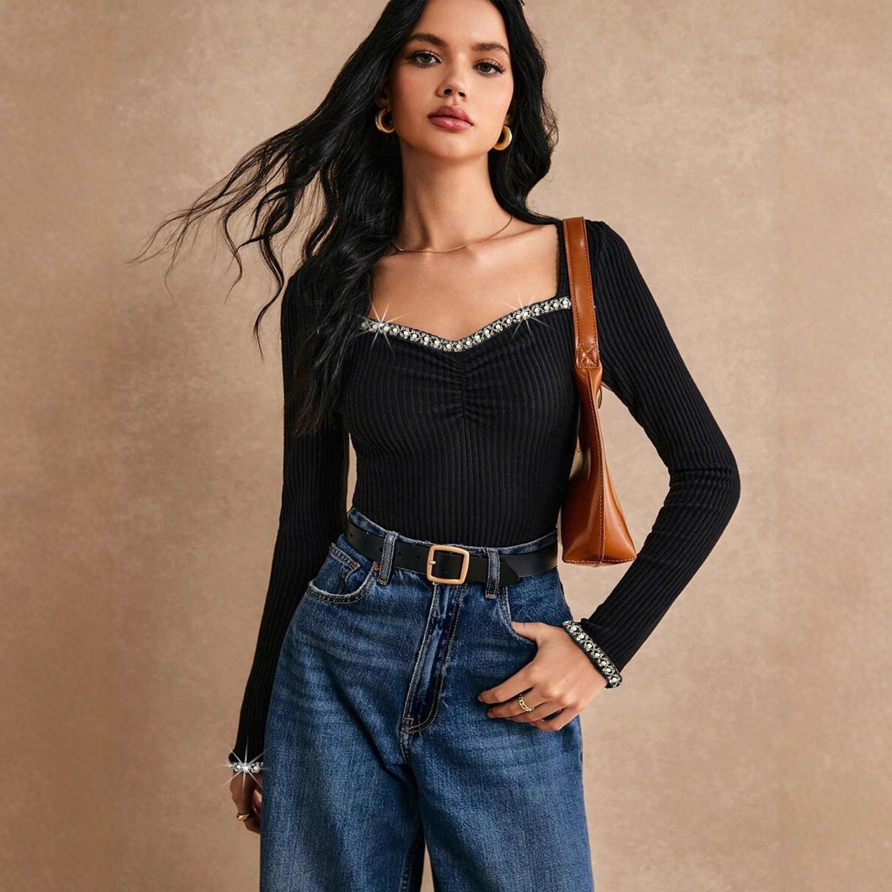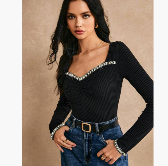 Women's Rhinestone-Embellished Slim-fit Long-sleeve T-shirt Fashion Base Layer Top