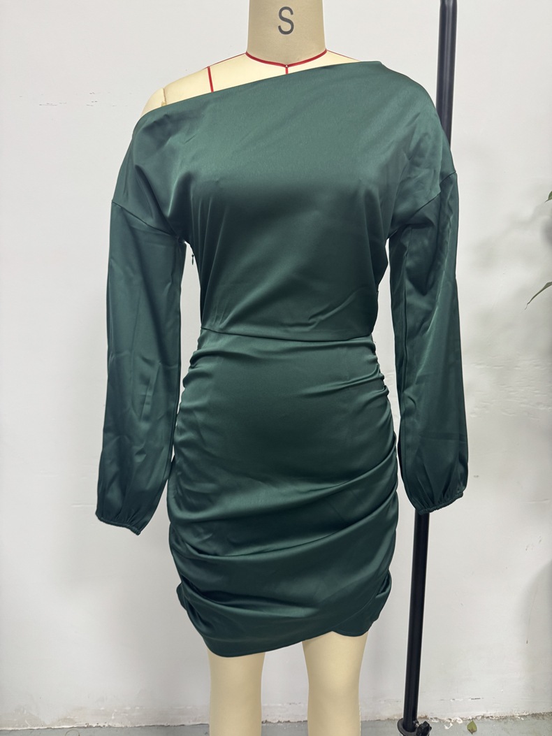 Womens Solid-Color One-Shoulder Long-Sleeve Satin Dress